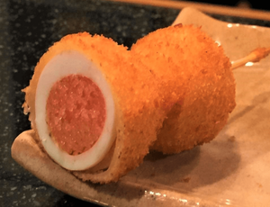 うずらを二つに切って、黄身を取り、明太子を詰め揚げている。明太子のプチプチの食感も味わえ、ぜひこちらもおすすめ料理だ。