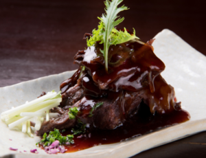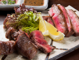 熟成させた九州産和牛のタンを使用。白タンの表面をしっかり焼き上げ、中身はレア。脂の甘みと肉の旨みがぎゅっと詰まり、口の中でそれがとろける。独自レシピのゴマだれとポン酢でどうぞ。