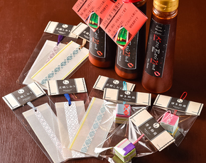 食事を楽しんで帰った後も、今日という善き日を思い出してもらえるように、お土産も用意している。博多織の生地で包んだ「博多鈴箱」、博多献上柄があしらわれた「正絹しおり」、明太子ベースの”喜友”オリジナルの調味料「KoreBariNma(これバリんま)」の、博多ならではの三種。