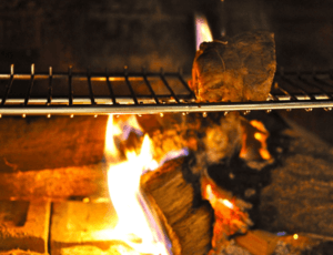 薪のスモーキーな香りが肉の味を引き立て