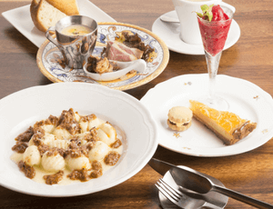 パスタは二種類からお好みをセレクト。前菜からドルチェまで充実の内容で、お得に優雅な気分を味わうことができる。