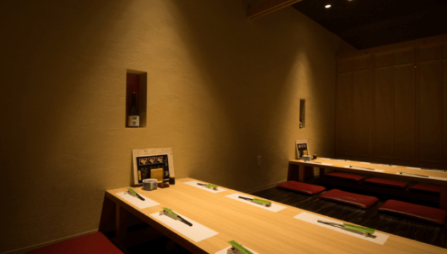 料理風景を観ながら楽しめる高級感のあるおしゃれなカウンター席。また、テーブル席や接待やデートに最適な掘りごたつ式個室もあり、様々なシーンに利用できる。