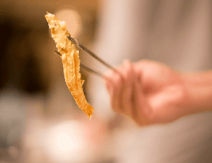 店主こだわりの天ぷらは、目の前で揚げたものを素早くテーブルやカウンターにて提供する。アツアツの揚げたてをご賞味あれ。