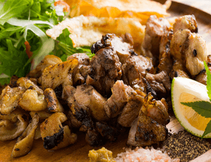 「炭火焼鶏三種盛り合わせ」が人気の理由は、半レアで食べられるほど鮮度抜群な朝引き鶏の中でも「親鳥」のみを使用。しっかりとした歯ごたえとジューシーさがたまらなく旨い。強火で一気に焼きすぎないよう、じっくりと焼き上げることで、鶏の旨みを閉じ込めた絶妙の焼き加減が美味しさの秘密だ。半レアの心地いい食感とほのかな炭の香りが食欲をそそぐ。